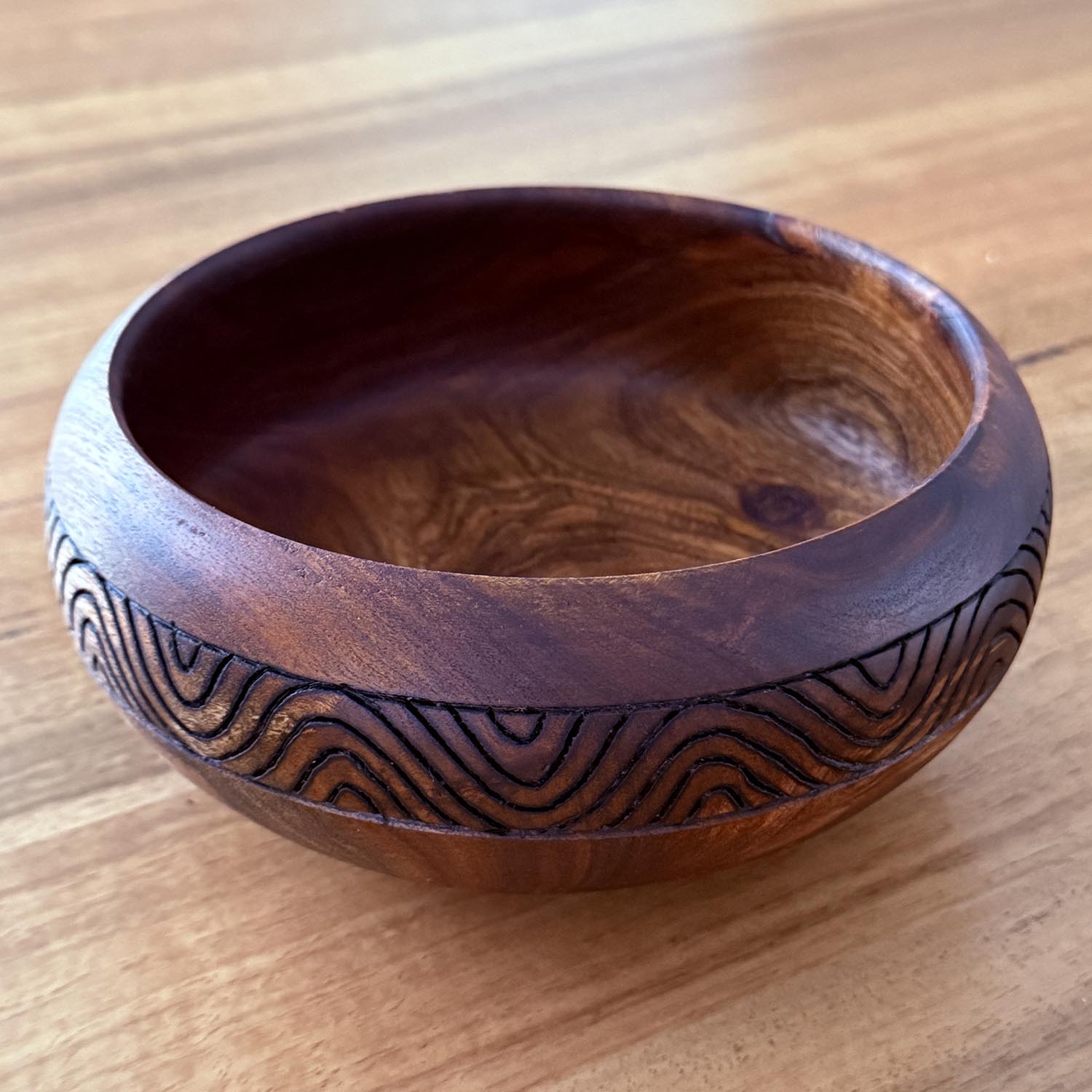 Carved from Blackwood, the Gali Bowl features fine burnt line-work encircling the exterior, symbolising a flowing river with Gali, the Gamilaraay word for water. Multiple coats of natural beeswax enhance and protect the timber, bringing the depth and movement of the grain to life.